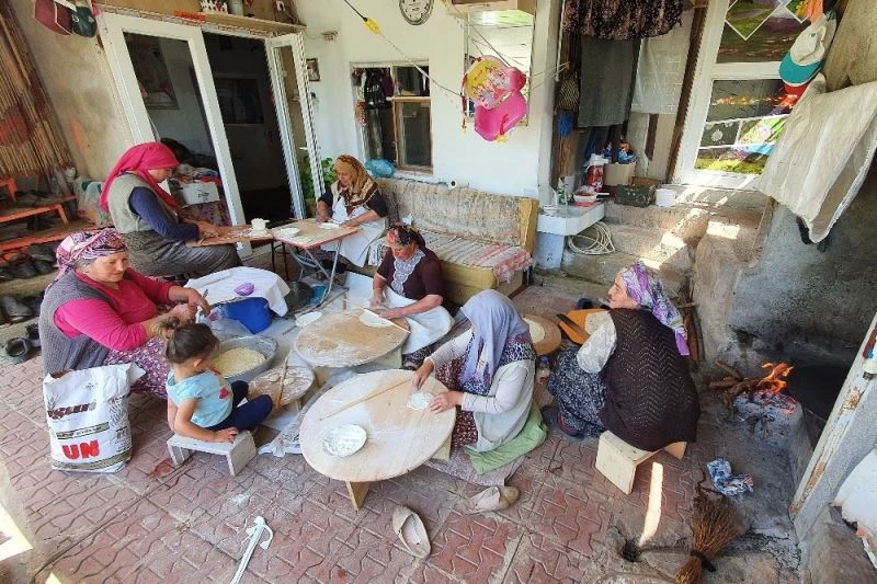 Mahalledeki birçok kadının bir araya gelerek yaptığı çalışmaların ardından birden fazla evin ihtiyacı hazırlanırken, külle sıvanmış saçta pişen yufkalar itinayla istiflenerek uygun şekilde depolanıyor.