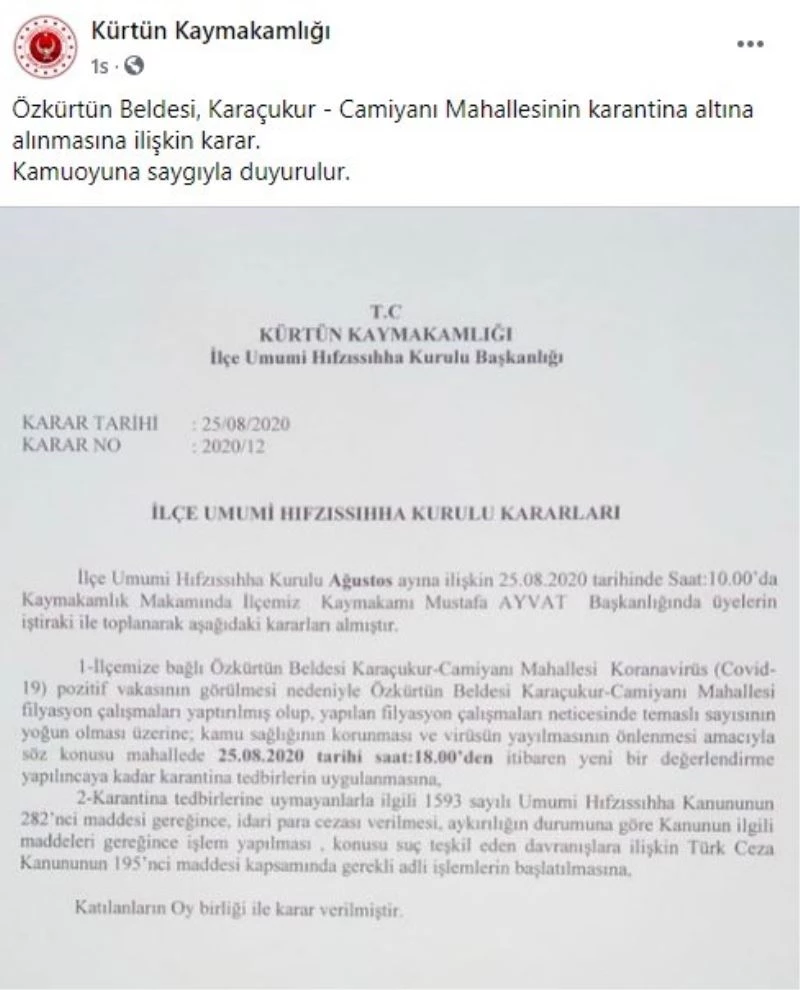 Konuyla ilgili karar Kaymakamlığın sosyal medya hesaplarından paylaşılarak, “İlimiz Kürtün İlçesi, Özkürtün Beldesi, Karaçukur-Camiyanı Mahallesinde koronavirüs (covid 19) testi pozitif çıkan vatandaşlarımız tespit edilmiş olup, filyasyon çalışmaları neticesinde; temaslı sayısının yoğun olması üzerine kamu sağlığının korunması ve virüsün yayılmasının önlenmesi amacıyla söz konusu mahallede bugün saat 18.00’den itibaren karantina tedbiri uygulanacaktır” denildi.