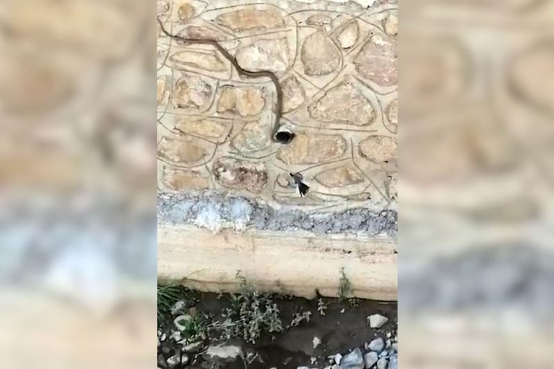 Merkeze bağlı Yeniköy köyünde akkuyruk sallayan kuşunun dere ıslahı duvarının içindeki yuvasına girmek isteyen yılanla mücadelesi vatandaşlar tarafından cep telefonuyla görüntülenirken, bu görüntüler izleyenlerin yüreğini burktu.