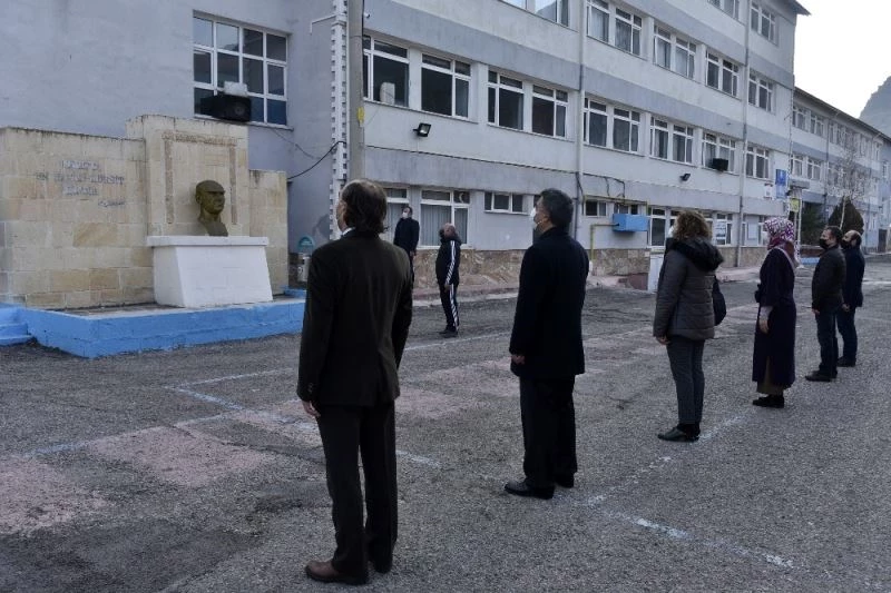 İl Milli Eğitim Müdürü Seydi Doğan, okul bahçesinde öğretmenlere yaptığı konuşmada pandemi sürecinde devam eden uzaktan eğitim çalışmalarının 22 Ocak’a kadar devam edeceğini hatırlatarak, “Bugün itibariyle Milli Eğitim Bakanlığı’nın organizasyonuyla tüm okullarımızda saat 10.00 itibariyle İstiklal Marşı’mız ortak bir şekilde okundu. 15 Şubat’tan sonra pandemi sürecinin parametreleri açısından bilim kurulunun, Bakanlığımızın kararlarıyla eğitim öğretim sürecine biran önce başlamak ve öğrencilerimizle buluşmayı arzu ediyoruz. Velilerimiz, öğretmenlerimiz, öğrencilerimiz çok zorlu, sıkıntılı bir süreci yürüttüler ve yürütmeye devam ediyorlar. Öğrenme kayıplarının oluşmaması adına öğretmenlerimizin vefakarca, cefakarca bu süreci takip ettiklerini biliyoruz. Bu noktada tüm öğretmen arkadaşlarımıza bu zorlu süreçte gösterdikleri çaba ve gayretten dolayı teşekkür ediyorum. İnşallah bu sıkıntılı günler en kısa zamanda aşılacaktır. Aşıyla ilgili sürecin tamamlanmasıyla buradaki risk oranının daha azalacağını, çocuklarımızla yüzyüze eğitime başlayacağımızı umut ediyoruz. Emekleriniz ve çabalarınız için teşekkür ediyorum” dedi.