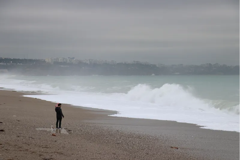 Konyaaltı Sahili'nde dalgalar oluştu. Olumsuz hava koşullarına rağmen bazı turist ve vatandaşlar, sahil bandında yürüyüş yaptı, dalgaları görüntülemeye çalıştı.