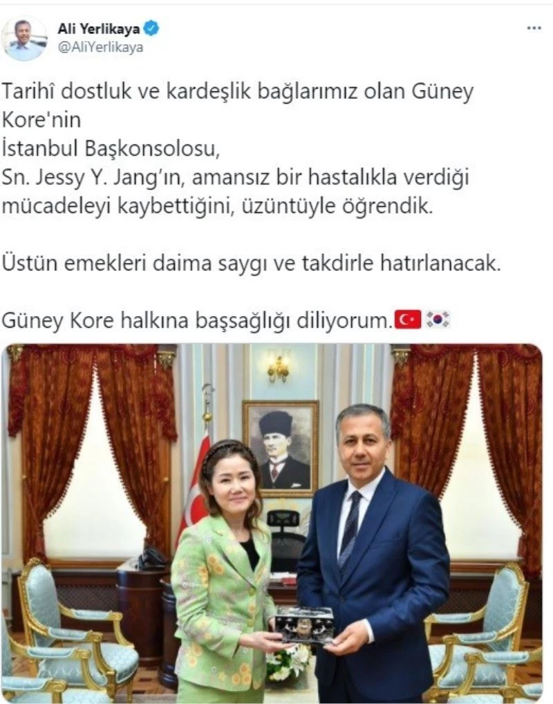 Güney Kore’nin İstanbul Başkonsolosu, Jessy Y. Jang hayatını kaybetti. İstanbul Valisi Ali Yerlikaya da sosyal medya hesabı üzerinden başsağlığı mesajı yayınlayarak, “Tarihi dostluk ve kardeşlik bağlarımız olan Güney Kore’nin İstanbul Başkonsolosu, Sn. Jessy Y. Jang’ın, amansız bir hastalıkla verdiği mücadeleyi kaybettiğini, üzüntüyle öğrendik. Üstün emekleri daima saygı ve takdirle hatırlanacak. Güney Kore halkına başsağlığı diliyorum” ifadelerini kullandı.