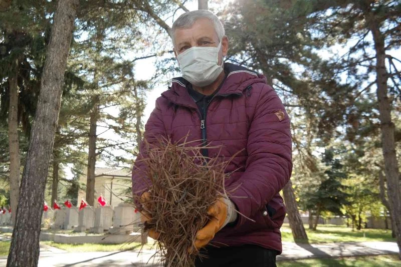 Eskişehir’de yaşayan Alparslan Aypiri, Hava Şehitliği’ndeki kuru çam iğnelerini toplayarak hem güvercinlerine yuva yapıyor hem de gönüllü olarak şehitliğin temizliğine yardımcı oluyor.