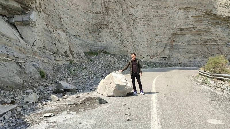 Sarı, yola düşen devasa büyüklükteki kayadan kıl payı kurtuldu. Kayadan sıçrayan taş parçaları aracın jantına, tamponuna ve farına isabet etti. Sarı, son anda yaptığı manevra ile kazayı maddi hasar ile atlattı.