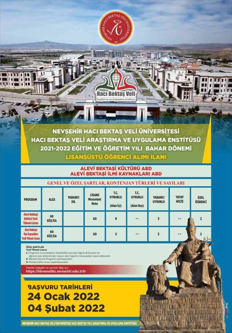 NEVÜ Hacı Bektaş Veli Araştırma ve Uygulama Enstitüsü Alevi Bektaşi Kültürü Anabilim Dalı ile Alevi Bektaşi İlmi Kaynakları Anabilim Dalı’na 2021-2022 Akademik Yılı Bahar Yarıyılı için tezli yüksek lisans öğrencilerinin yanı sıra yatay geçiş yoluyla yüksek lisans öğrencileri kabul edecek. Türkiye Cumhuriyeti vatandaşı adaylar başvurularını 24 Ocak - 04 Şubat 2022 tarihleri arasında http://aday.nevsehir.edu.tr adresi üzerinden çevirim içi olarak yaparken, uluslararası öğrenciler ise başvurularını https://intstudent.nevsehir.edu.tr adresinden 24 Ocak - 04 Şubat 2022 tarihleri arasında gerçekleştirecekler.
