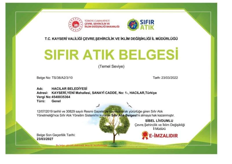 Türkiye Cumhuriyeti Çevre Şehircilik ve İklim Değişikliği Bakanlığı tarafından ’Sıfır Atık’ Projesi; kapsamında israfın önlenmesi, kaynakların daha verimli kullanılması, oluşan atık miktarının azaltılması, etkin toplama sisteminin kurulması ve atıkların geri kazanılması kapsamında başlatılan proje çerçevesinde, Hacılar Belediyesi’nin sıfır atık belgesini almaya hak kazandığını ifade eden Hacılar Belediye Başkanı Av. Bilal Özdoğan, “Amacımız yapılan projelerle gelecek nesillere yaşanılabilir bir çevre bırakmak ” dedi. TEMA Arıtım ve Çevre Danışmanlığı firması çevre mühendisleri ile Çevre Şehircilik ve İklim Değişikliği İl Müdürlüğü tarafından sıfır atık yönetmeliği kapsamında gerçekleştirilen denetimler sonrasında Hacılar Belediyesi’nin sıfır atık belgesinin almaya hak kazandığını hatırlatan Başkan Özdoğan; ’Sıfır Atık’ projesiyle üretimin devamlılığını sağlayıp gelecek nesillere yaşanabilir bir dünya bırakmak için gereken tüm hedefleri hammadde temini, israfın önlenmesi, kaynakları verimli kullanarak gelecek nesillere yaşanabilir bir çevre bırakmak için yola çıktıklarını belirtti.