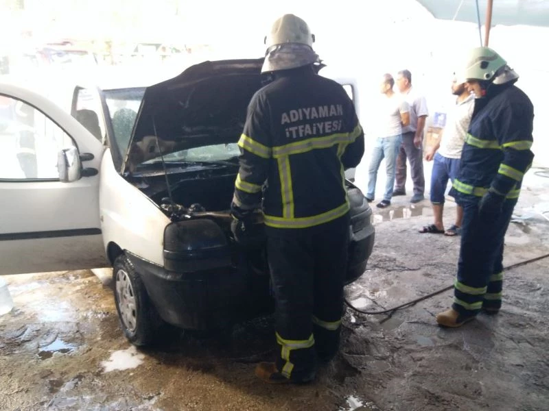 Adıyaman’da, sürücüsü tarafından pak edildikten kısa bir süre alev alev yanan hafif ticari araç paniğe neden oldu.