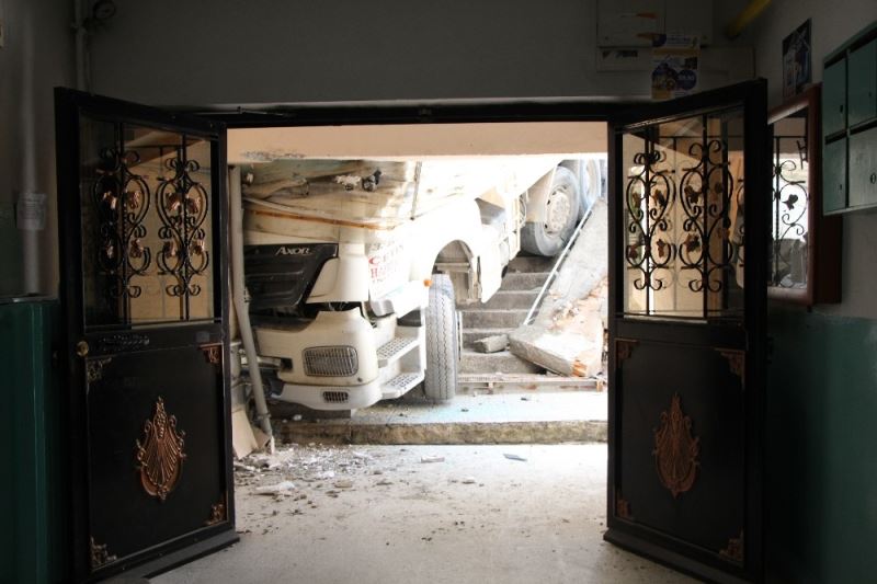 Eskişehir’de sabah saatlerinde meydana gelen olayda, park halindeyken hareket eden hafriyat yüklü kamyon bir apartmanın giriş kısmına çarparak durabildi.