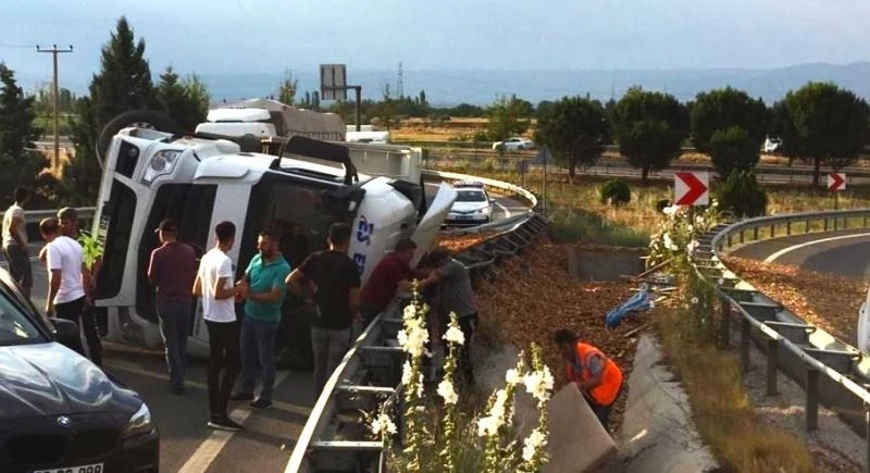 Denizli’de viraja hızlı giren hafriyat kamyonunun devrilmesi sonucu tonlarca talaş yola dökülerek trafiği kapattı.