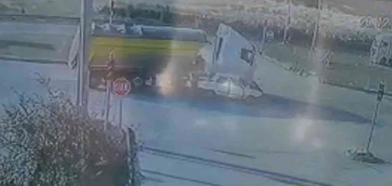 Kırıkkale’de hafriyat kamyonunun kavşaktan dönmeye çalışan otomobile çarptı. Hurdaya dönen otomobildeki 2 kişi ağır yaralanırken, kaza anı güvenlik kamerasına yansıdı.