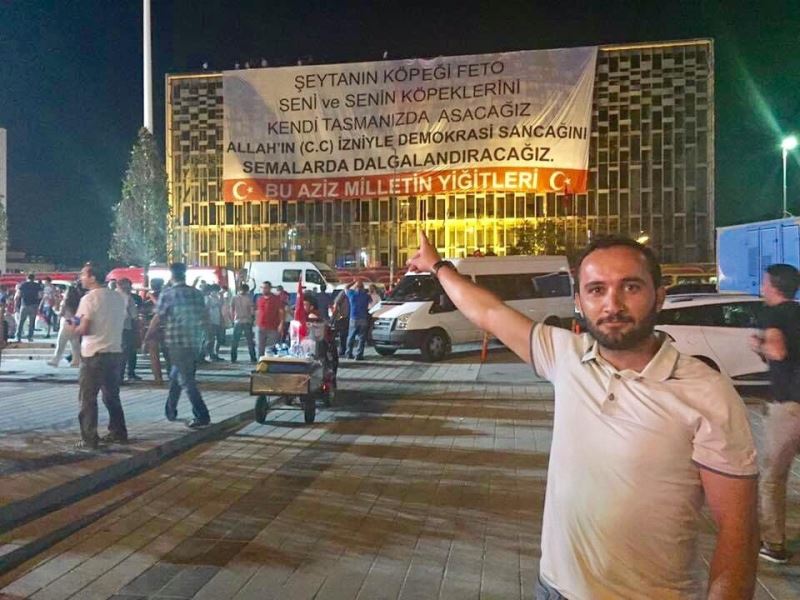 Dumlu, halkın o gece çok büyük bir direniş sergilediğini ifade ederek, “Kent Meydanına gittiğimizde toplam 15 kişi falan vardı. Herkes telefonlarından süreci takip ediyor ve oradaki milletin tek derdi Cumhurbaşkanından bir haber duymaktı. İlerleyen saatlerde Turgay Güler’in programda Diyanet İşlerini göreve çağırarak camilerde selalar okunmalı ve halkı sokağa davet edilmeli açıklaması sonrası camilerde selalar okunmaya başladı. MHP genel başkanı Devlet Bahçeli’nin de seçilmiş hükümeti destekler nitelikte açıklaması da vatandaşları mutlu etmişti. Kalabalık artıyordu ve Cumhurbaşkanımız Recep Tayyip Erdoğan’ın açıklaması bizleri hem mutlu etti hem de güç verdi. Çünkü o konuşmada, TSK içerisindeki bir azınlığın böyle bir kalkışmaya girdiğini söylüyordu. İlk başta da söylediğim gibi yıllardır başta güvenlik güçlerinin içi olmak üzere devlet kurum ve kuruluşlara sızan milli ve yerli olmayan yapıların yaptıkları kalkışmalarından bu milletin korkusu yoktu. Çünkü gerek devlet kurumlarında gerekse güvenlik teşkilatlarımızın içindeki vatan, bayrak, devlet aşkını her şeyden önde tutan bir kesim vardı. Halk onlardan, onlar halktan destek aldı o gece. Halk o gece hiç ölümü düşünmüyordu ve ortamda farklı bir hava vardı. Herkes bir birinden destek alıyordu” dedi.