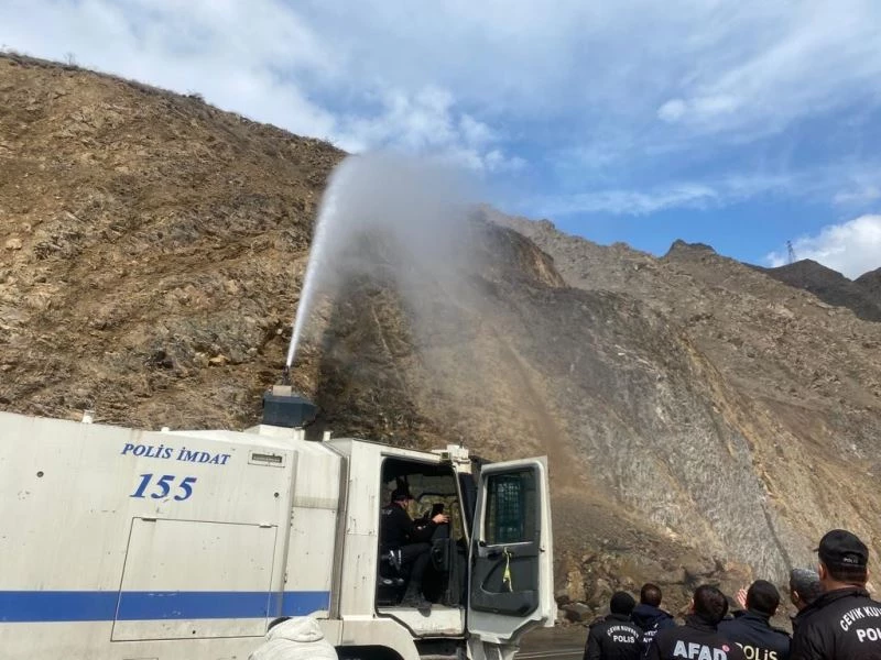 Yola düşme tehlikesi bulunan kayalara polis ekipleri TOMA’dan tazyikli su sıkarak indirmeyi başardı.