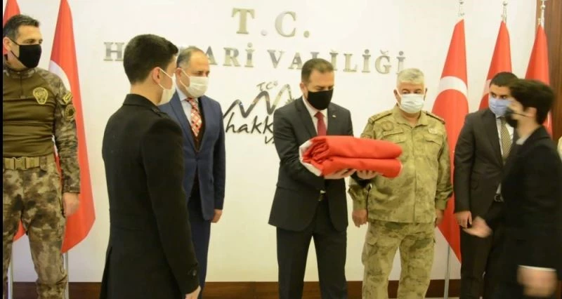 Valilikte düzenlenen törene Hakkari Valisi ve Belediye Başkan Vekili İdris Akbıyık, İl Jandarma Komutanı Tuğgeneral Ahmet Kavukçu, Emniyet Müdürü Atanur Aydın, Aile, Çalışma ve Sosyal Hizmetler İl Müdürü Salih Kaya katıldı. Van Aile, Çalışma ve Sosyal Hizmetler İl Müdürü Yardımcısı Mehmet Salih Atlı, Sosyolog Rukiye Kaya ve öğrenci Nurgül Tayancan refakatinde Hakkari’ye getirilen bayrak, kenti temsil eden öğrenci Muharrem Değirmenci’ye teslim edildi.