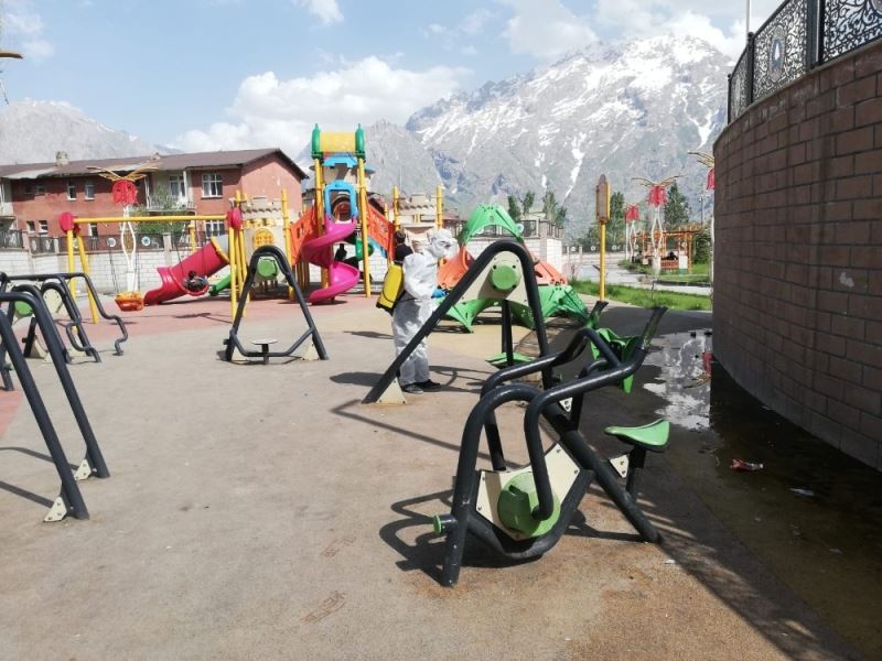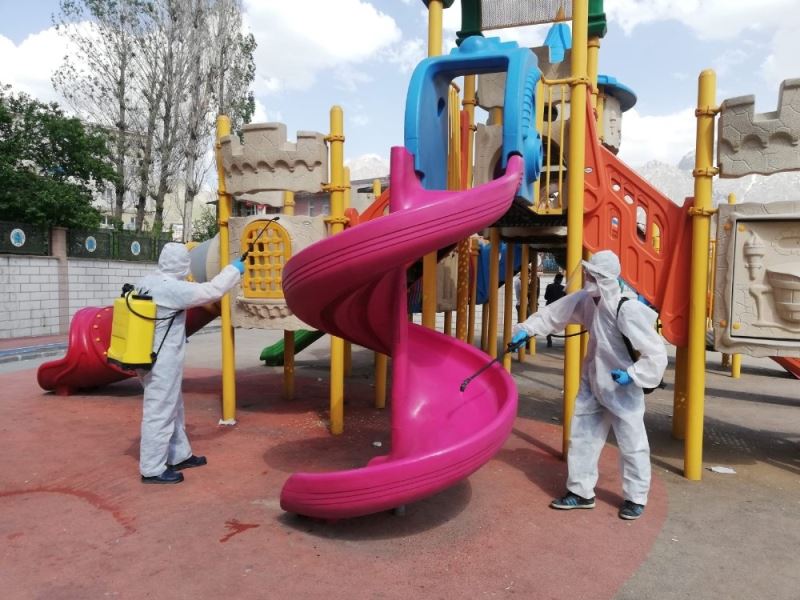 Hakkari Belediyesi Veteriner İşleri Müdürlüğü dezenfekte ekibi, çocuk parklarını dezenfekte etti.