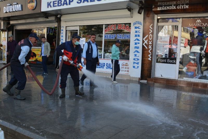 Hakkari Belediyesi, cadde ve sokaklarla bazı iş yerlerinin camlarını köpüklü suyla dezenfekte etti.