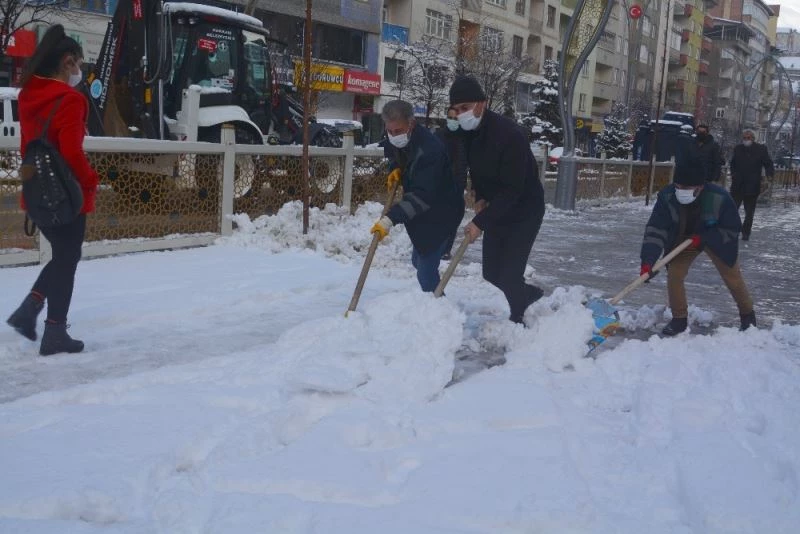 Belediye önü başta olmak üzere birçok noktayı küreklerle kardan temizleyen kürekli kar timleri, çalışmalarını aralıksız olarak sürdürüyor.