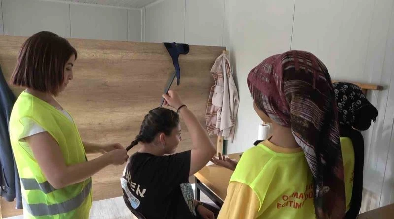 Kahramanmaraş merkezli depremlerin etkilediği iller arasında yer alan Osmaniye’de, Halk Eğitim Merkezi Kuaförlük Bölümü usta öğreticisi Esma Özdemir; Çıraklık Eğitim Merkezi Bayan Kuaförlüğü Bölümü öğrencileri Gülcan Atıcı ve Gülşah Kara ile birlikte Osmaniye Liseler kampüsünde kurulan çadır kentte yaşayan depremzedelere hizmet veriyor.
