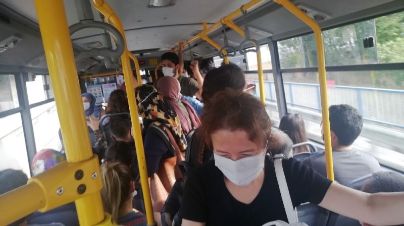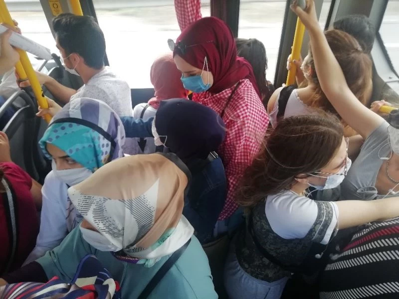 Kocaeli’de Dikey Geçiş Sınavı (DGS) olması sebebiyle sabahın erken saatlerinde otobüslerde yoğunluk oluştu. Pandemi kuralları sebebiyle otobüs kooperatifi erken önlem almayınca, nefes alacak yer kalmadı. Vatandaşlar otobüs şoförüne sosyal mesafeyi korumadığı için tepki gösterdi.