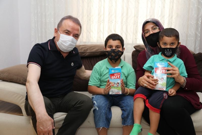 Antalya Büyükşehir Belediye Başkanı Muhittin Böcek’in, seçim vaatleri arasında yer alan “Halk Süt” projesinde sütler çocuklarla buluşmaya başladı. Antalya Büyükşehir Belediyesi’ne yapılan başvurular sonucu ihtiyaç sahibi olduğu tespit edilen ailelerin 2-5 yaş arasındaki çocuklarına süt dağıtımları yapılıyor. Büyükşehir Belediye Başkanı Muhittin Böcek de annesi Tuğba Cihan’ın başvurusuyla 3 yaşındaki Toprak’a sütünü teslim etti. Başkan Böcek, Toprak ile ağabeyi Kutlu’ya kırtasiye seti de hediye etti.