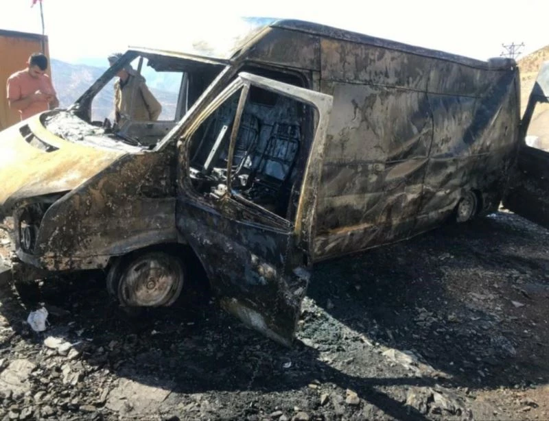 Şırnak’ta bir minibüs yokuş çıkarken hararetinin yükselmesi sonucu alev aldı. Kısa sürede alevlere teslim olan minibüs yanarak hurdaya döndü.