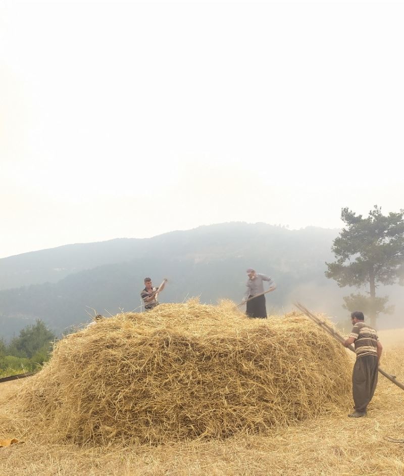 Kışlık mahsullerini hazırladıklarını söyleyen çiftçilerden Faruk Yiğenoğlu, "Günler süren orakla ekin biçiminin ardından patozu kurarak buğday ile samanı birbirinden ayırıyoruz. Bu zor süreçte hem kadınlarımız hem erkeklerimiz olarak yoğun bir süreçten geçtik. Gönül isterdi biçerdöver olsun ama tarlalarımız engebeli olduğu için yine eski yöntemler ile ürünümüzün hasadını tamamladık” dedi.