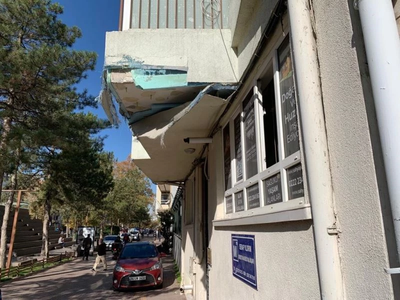 Eskişehir Deliklitaş mahallesinde bulunan bir binanın hasarlı balkonu, yoldan geçen insanlar için tehlike oluşturuyor.