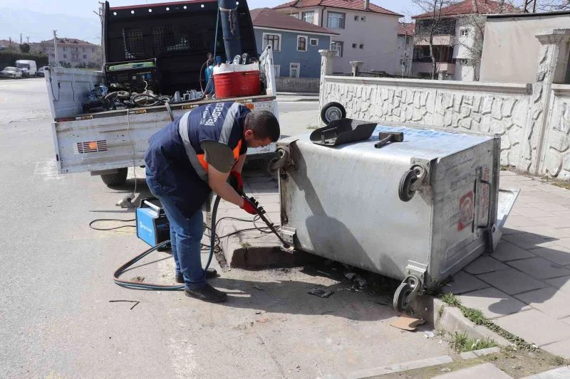 Düzce Belediyesi Destek Hizmetleri Müdürlüğü, kent merkezi başta olmak üzere mahalle ve cadde üzerlerinde zamanla hasar gören çöp konteynerlerini yerinde tamir ediyor.