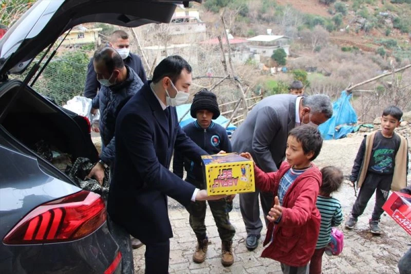 Korkmaz ve Karakaş, ziyaretlerinde çocuklara da çeşitli hediyeler veriyor.