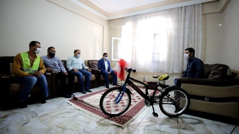 Eyyübiye Belediye Başkan Yardımcısı Ali Çiftçi ile Sosyal Yardım İşleri Müdürü Mustafa Aslan, Belediye Başkanı Mehmet Kuş’un talimatlarıyla, geçtiğimiz günlerde temizlik aracıyla Türkan bebeği hastaneye yetiştiren temizlik personeli Eyüp Yıldız’ı ziyaret etti. Belediye Temizlik İşleri Müdürlüğünde çöp aracı şoförü olan Eyüp Yıldız, rutin çalışma esnasında bir annenin kucağında havale geçiren kızıyla sokağa fırladığını gördü. Ambulansı beklemeyen ve anneyi Şanlıurfa Eğitim ve Araştırma Hastanesine yetiştiren kahraman personel büyük takdir toplamıştı. Eyyübiye Belediye Başkan Yardımcısı Ali Çiftçi, Şanlıurfa Rahmet Derneği ve Sosyal Yardım İşleri Müdürlüğü ekipleriyle temizlik personeli Eyüp Yıldız’ı evinde ziyaret edip, Rahmet Derneği aracılığıyla oğluna bisiklet ve kendisine de ikramiye verdi.