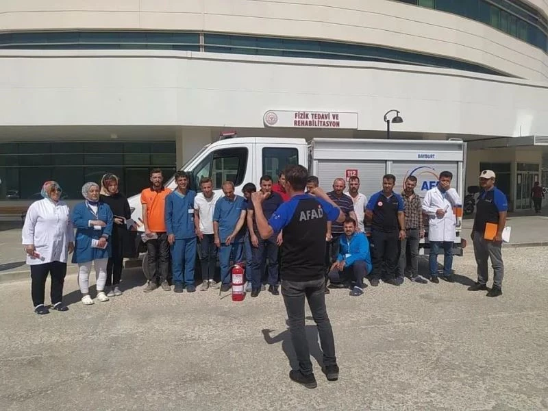 Bayburt İl Afet ve Acil Durum (AFAD) Müdürlüğü ekipleri, 2022 Afet Tatbikat Yılı olması sebebiyle Bayburt Devlet Hastanesinde eğitim verdi. Hastane personelleri ile yangın ve tahliye tatbikatı gerçekleştiren ekipler, koordine edilen tatbikatta yangın sirenlerinin çalması ile hızla binayı terk eden personellere dışarıda yangın tüplerinin kullanımı, yangın çeşitleri ve söndürme teknikleri hakkında bilgiler verdi.