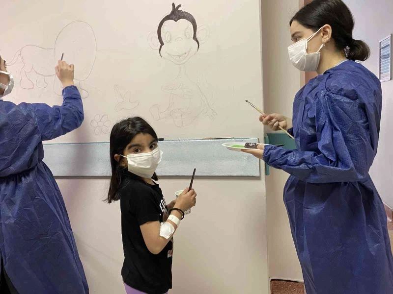 Kartal’da bir hastanede çocuk servisinde yatan hastalar, lise öğrencileri ile beraber hastane servisinin duvarına resimler çizerek rengarenk hale getirdi.