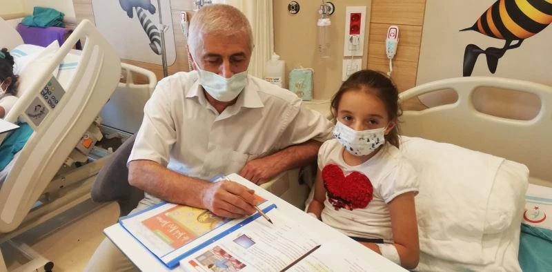 Erzurum Şehir Hastanesinde yanık tedavi merkezinde tedavi gören Havin Aslan (7) ve Amine Demir (9) hastanenin sınıf öğretmeni Halil Elitok nezaretinde eğitimlerinden geri kalmıyorlar.