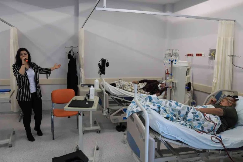 Müzik öğretmeni Dilruba Yakut da, "Diyaliz hastalarına moral olsun diye buraya geliyorum. Müzikler çalıyoruz, söylüyoruz. Onlarda sağ olsunlar kırmıyorlar ve bize eşlik ediyorlar. Eğlenceli güzel bazen de dertli günlerimiz geçiyor. Burada Emine teyzem var akrabamız olduğu için evde çalıp, söyleriz, oda bizi videoya almış. Burada çalışırken, videoyu açıyor ve dinliyor. Daha sonra hastaları bunu kim söylüyor diye soruyor. Oda benim akrabam var diyerek beni söylüyor. Bu vesile ile bu etkinliğe başladık. Buraya geliyorum ve müzikler söylüyorum. Hastalar beni istiyorlar. İstedikleri içinde kırmadım. Motivasyon olsun diye söyledim” diye konuştu.