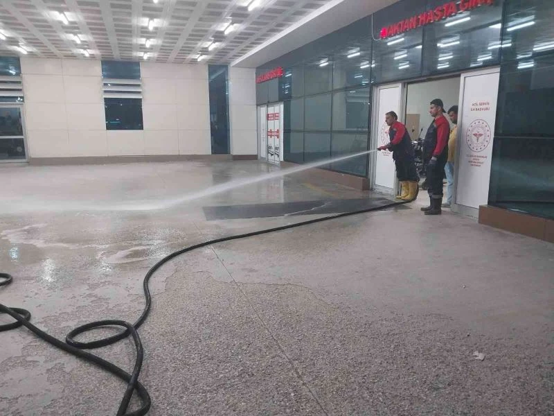 Düzce Belediyesi’ne bağlı ekipler Düzce Atatürk Devlet Hastanesi Acil Servis ve Poliklinik önü ile hastane bahçesinde basınçlı su ile yıkama ve dezenfekte çalışması yaptı.