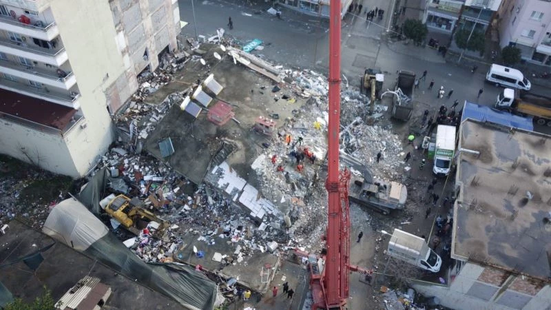 Kahramanmaraş’ta meydana gelen depremler 10 ilde yıkıma neden oldu. En çok yıkımın olduğu iller arasında yer alan Hatay’da da tüm ilçeler de ciddi oranda hasar meydana geldi. Payas ilçesinde de yaklaşık 15 bina çöktü. Çöken 5 katlı bir binada süren arama kurtarma çalışması havadan görüntülendi.