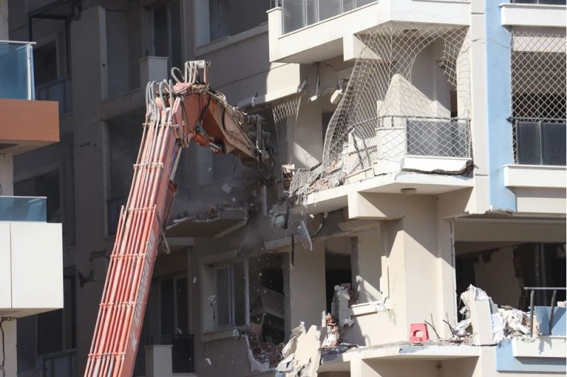 Çevresinde güvenlik önlemi alınan binalar, ekiplerin kontrolünde iş makineleriyle yıkıldı.