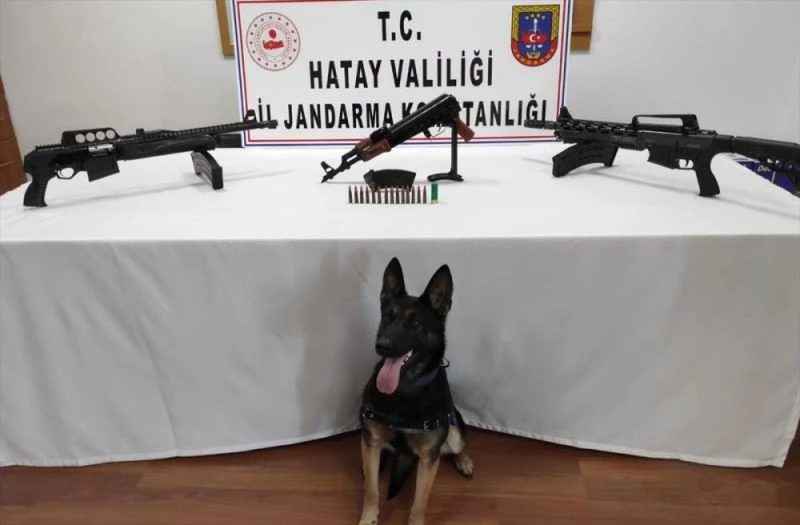 Dedektör köpek "Leydi"nin de katılımıyla bölgede arama yapan ekipler, toprağa gömülü 2 otomatik av tüfeği, kalaşnikof, şarjör ve 15 fişek ele geçirdi.