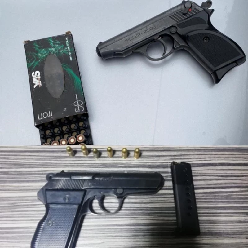 Adreslerde arama da yapan polis, 2 ruhsatsız tabanca ve bunlara ait mermi ile 16 bin 700 lira para ele geçirdi.