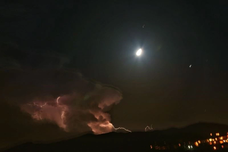 Hatay’da akşam saatlerinde başlayan şimşek şöleni ay ve yıldız manzarası ile görsel şölene dönüştü.