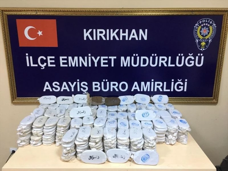 HATAY (AA) - Hatay'in Kirikhan ilçesinde bir evin banyosunda 98 kilo 125 gram esrar ele geçirildi, Suriyeli 3 zanli gözaltina alindi.