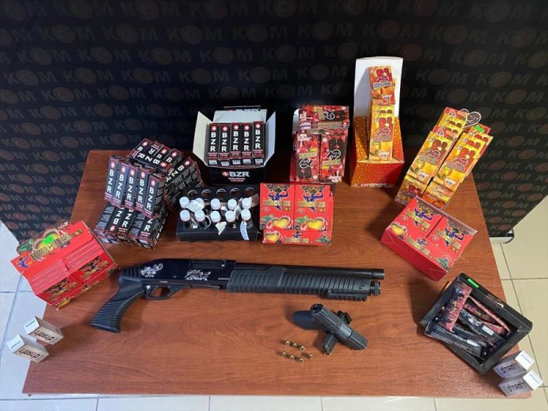 İş yerinde aramada yapan polis, tabanca ve pompalı tüfek ile fişeği, cinsel içerikli gümrük kaçağı 9 macun, 48 içecek, 99 toz, 66 sprey ve 4 kutu damla ele geçirdi.