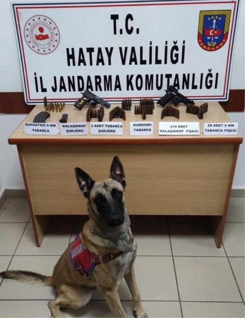 Antakya İlçe Jandarma Komutanlığı tarafından jandarma dedektifleri (JASAT) ve Rodi isimli narkotik arama köpeği ile birlikte şüpheliye ait evde yapılan aramada 1 adet Ak-47 Kalaşnikof marka silaha ait şarjör, 210 adet 7.62 mm fişek, 1 adet ruhsatsız CZ 75 marka 9 mm çapında tabanca, tabancaya ait 2 adet şarjör ve 29 adet tabanca fişeği, 1 adet Blow F92 marka 9 mm faturasız kuru sıkı tabanca ve tabancaya ait 1 adet şarjör ele geçirildi.