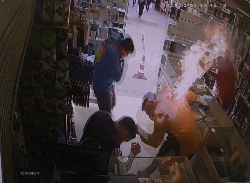 Telefondan çıkan alevler müşterinin üzerine sıçradı.