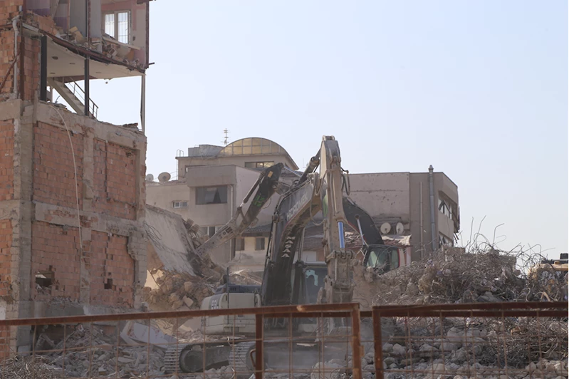 Merkez Antakya ilçesinde, 6 Şubat'taki afetin ardından yıkım kararı verilen yapılardaki çalışmalar devam etti.