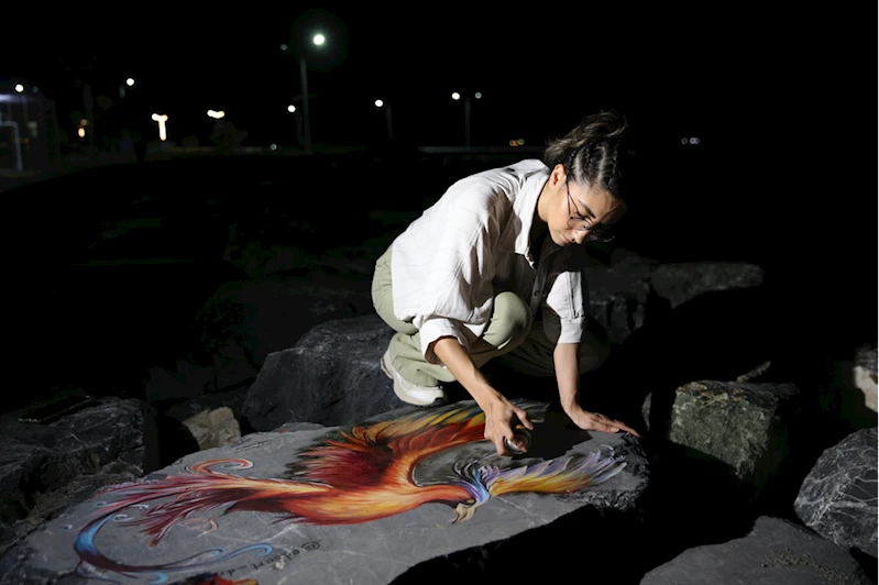 HATAY - Hatay'ın İskenderun ilçesinde depremde yıkılan binanın enkazından kurtarılan 25 yaşındaki ressam Edanur Sarar, sahil şeridindeki kayalara çizdiği resimlerle afetin etkilerini unutmaya çalışıyor.