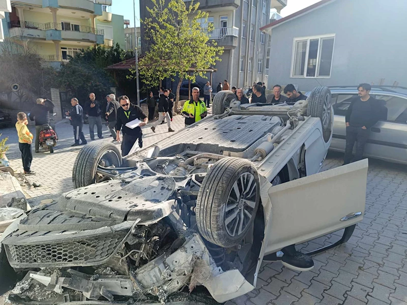Bir binanın duvarına çarptıktan sonra devrilen araçtaki sürücü ve karısı M.Ö. yaralandı.