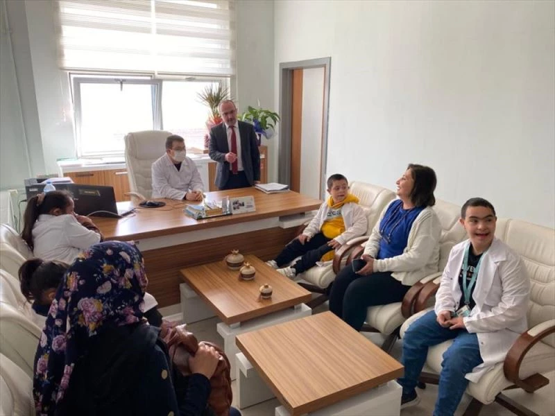 Reyhanlı ilçesinde özel bir rehabilitasyon merkezinde eğitim gören down sendromlu 5 öğrenci, Toplum Sağlığı Merkezinde görevli sağlıkçılar tarafından gerçekleştirilen etkinlikte Kumlu Devlet Hastanesini ziyaret etti.