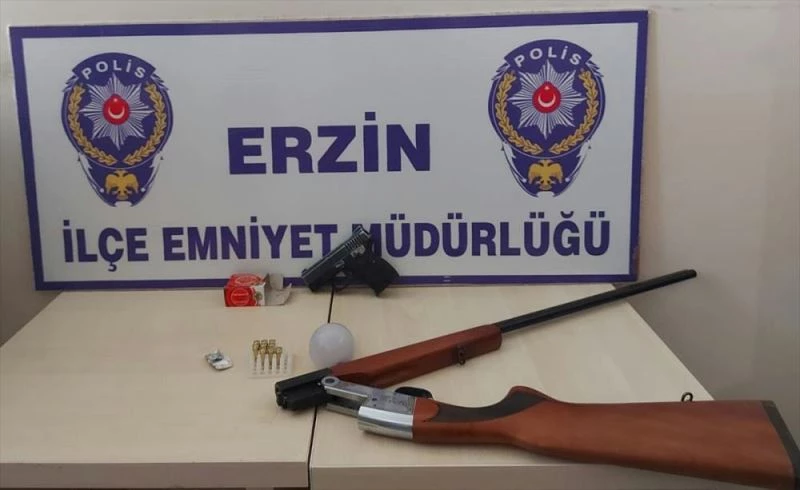 Adreslerde 59 uyuşturucu hap, tabanca, av tüfeği ve 9 tabanca fişeği ele geçirildi.