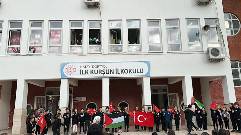 İlk Kurşun İlkokulu bahçesinde düzenlenen etkinlikte, öğrenciler Türk ve Filistin bayraklarıyla şiir okudu.