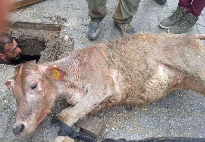 Hatay’da kaçan inek kanalizasyona sıkışmış halde bulundu